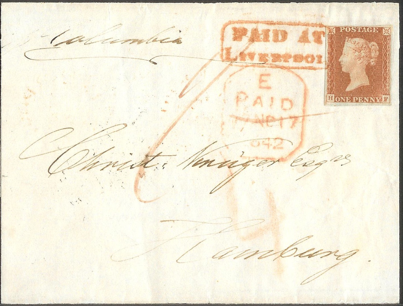 [HF] plate 19, from Liverpool to Hamburg, dated 16 November 1842, cancelled solely with a red boxed “Paid At | Liverpool” [e]