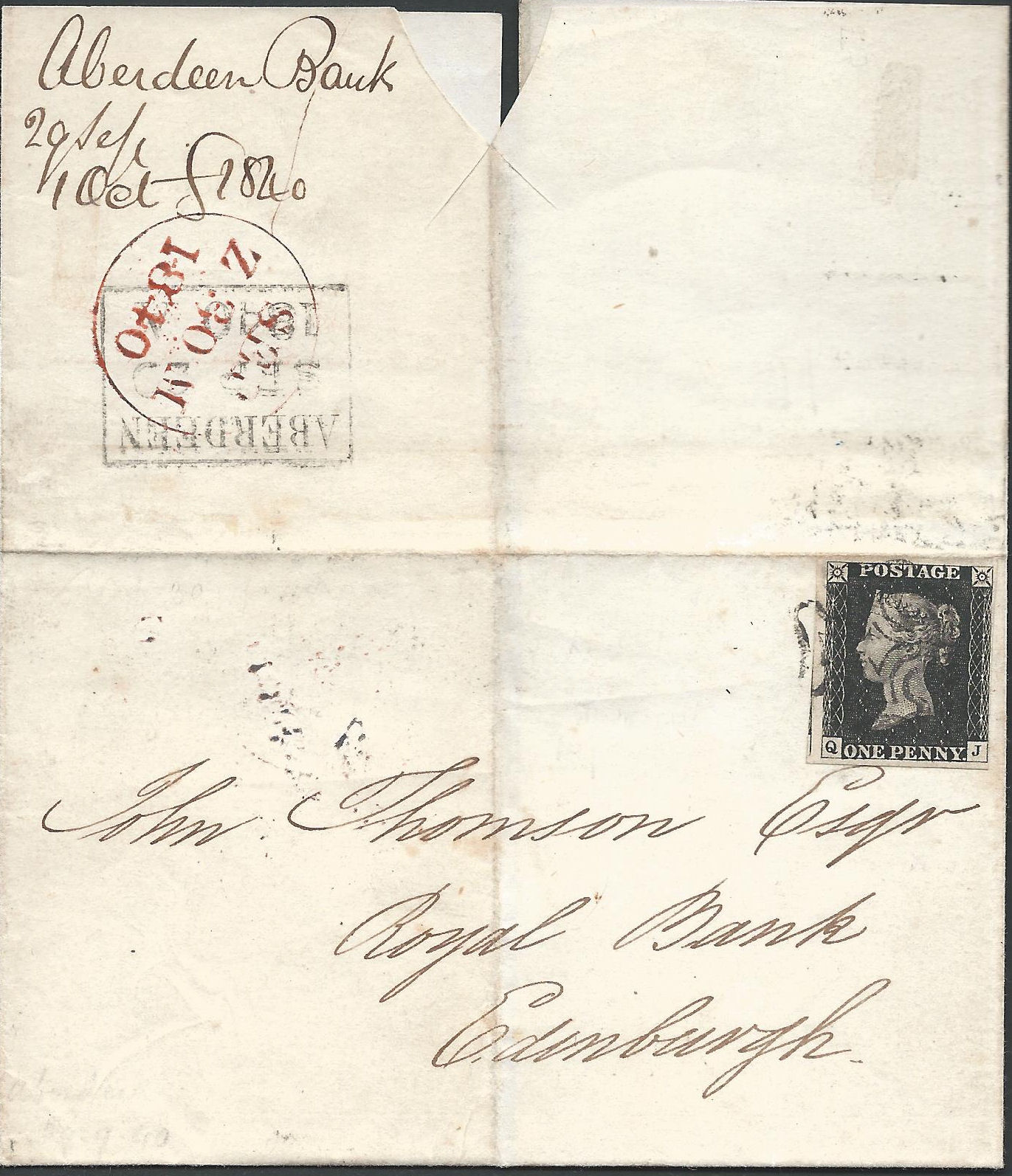 [QJ] plate 1b, from Aberdeen to Edinburgh, dated 29 September 1840, cancelled with a blackMaltese cross Unofficial early use of the black cross