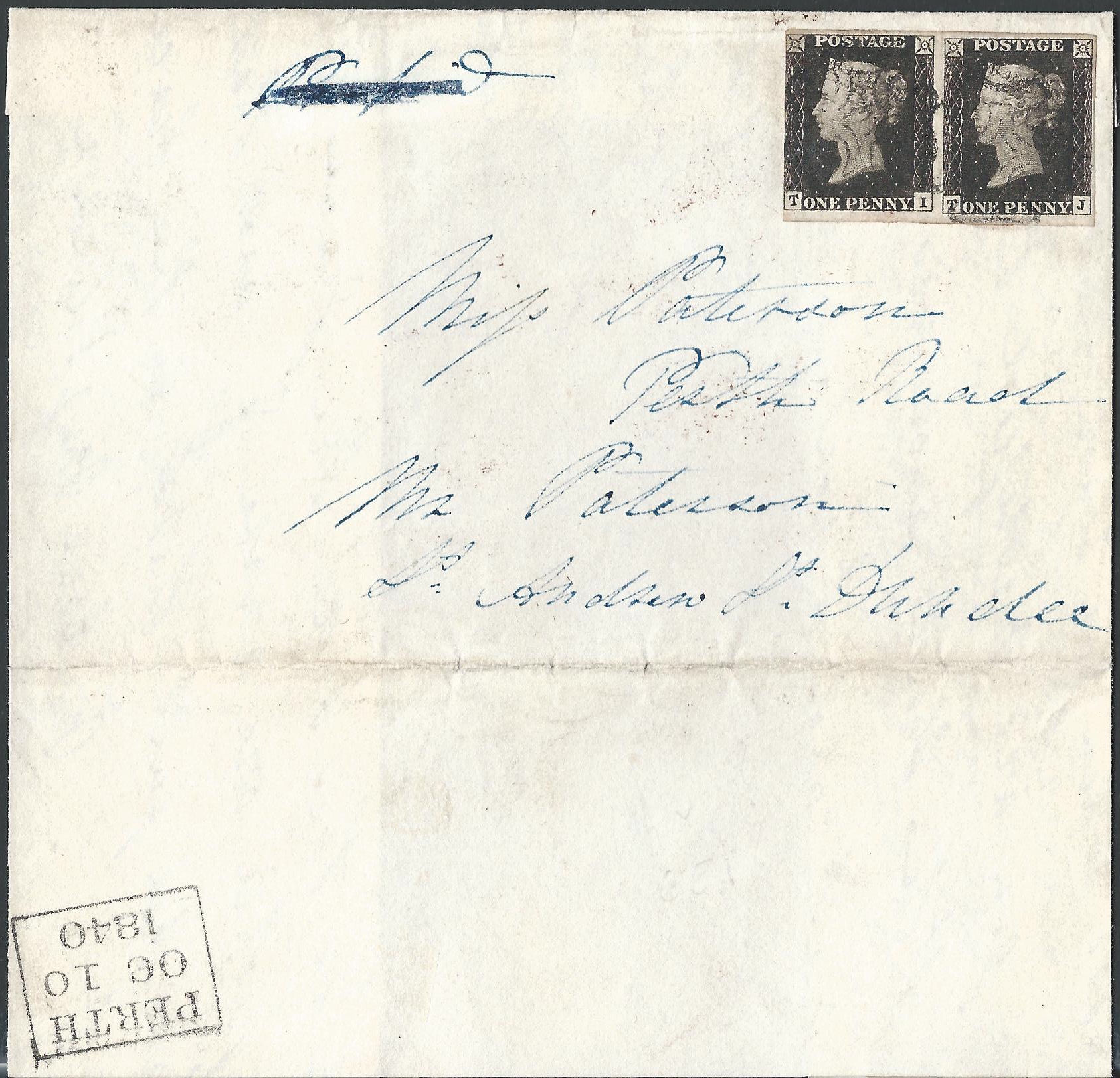 [TI-TJ] plate 1a, from Perth to Dundee, dated 10 October 1840, cancelled with black Maltese crosses