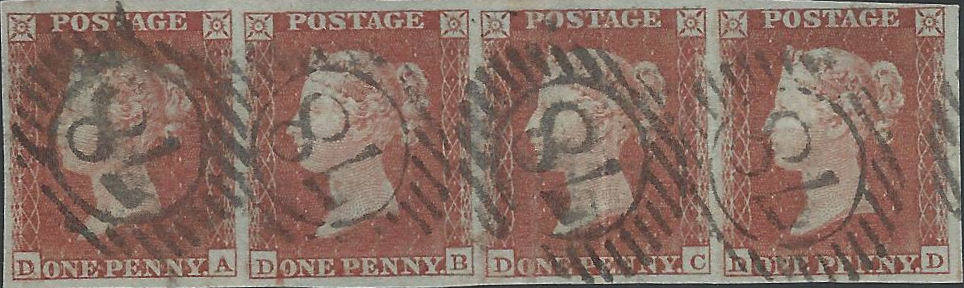 [DA-DD] strip of four, plate 150, cancelled withblack London numerals (District 78)
