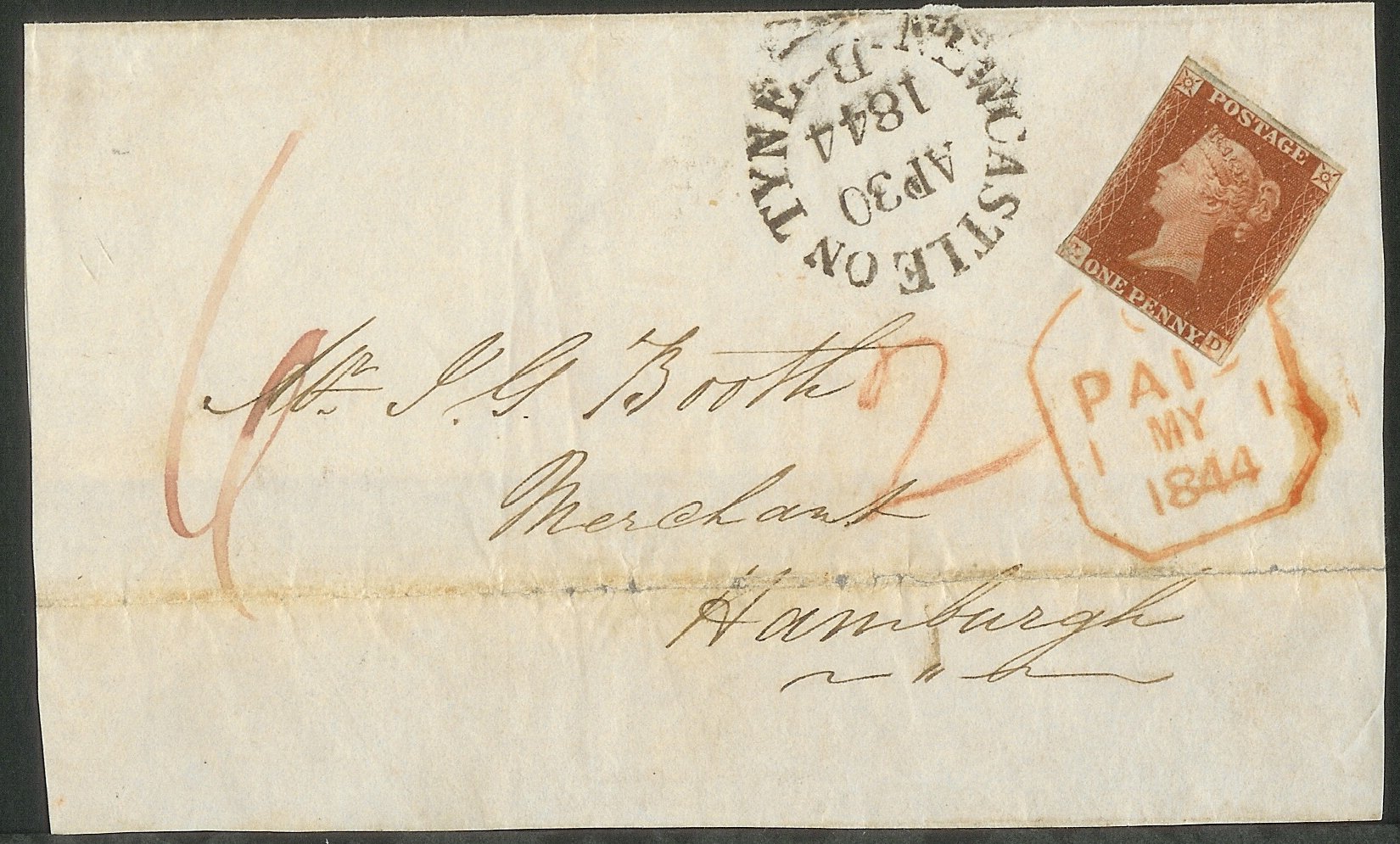 [LD] plate 42 on dated piece from Newcastle to Hamburg dated 30 April 1844, cancelled whilst in transit through London with Red “Tombstone” on 1 May 1844 [cert].