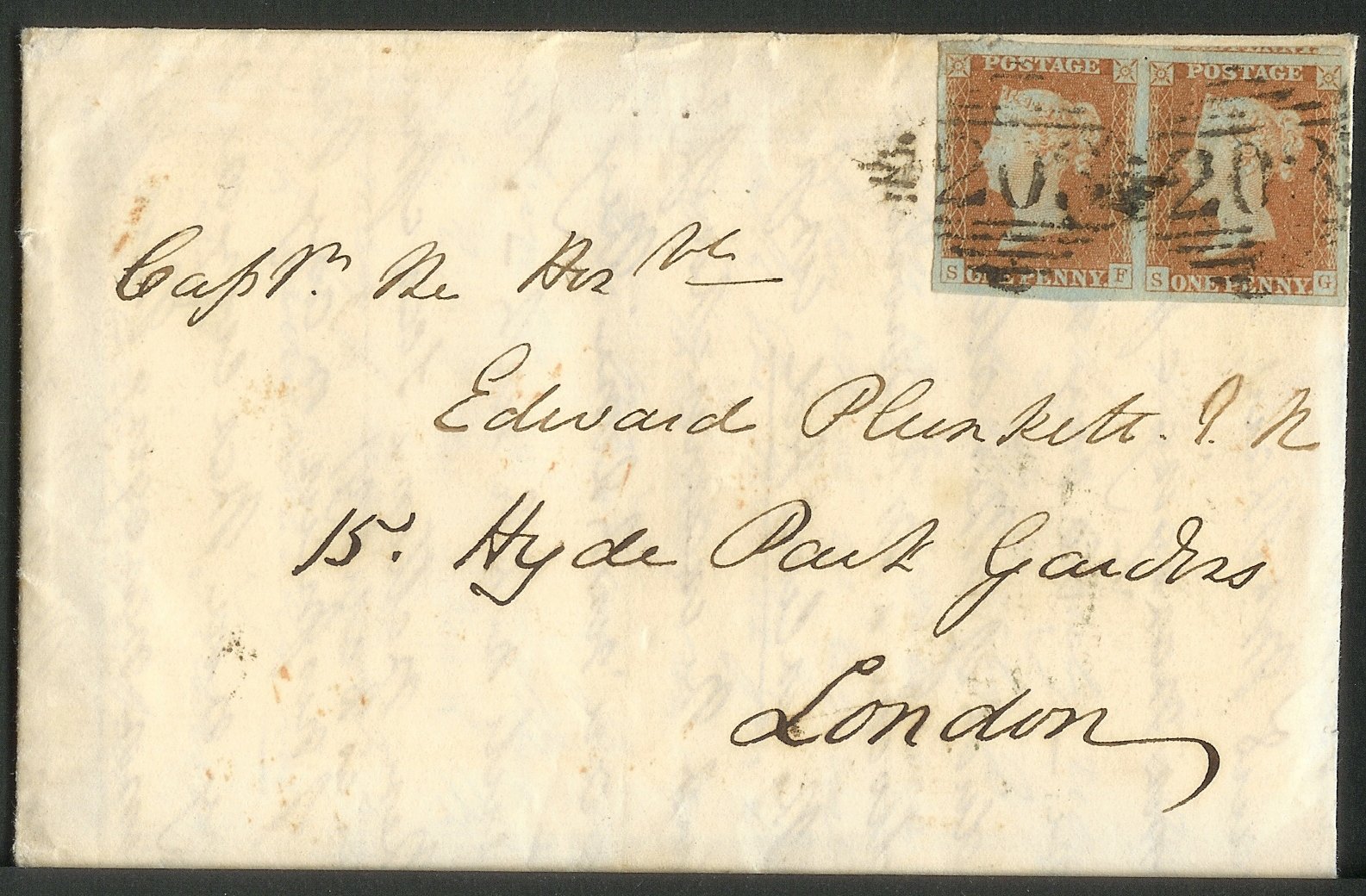 [SF-SG] pair, plate 24, from Dunshaughlin to London, dated 18 October 1847, cancelled with black Irish numerals (203 Dunshaughlin)