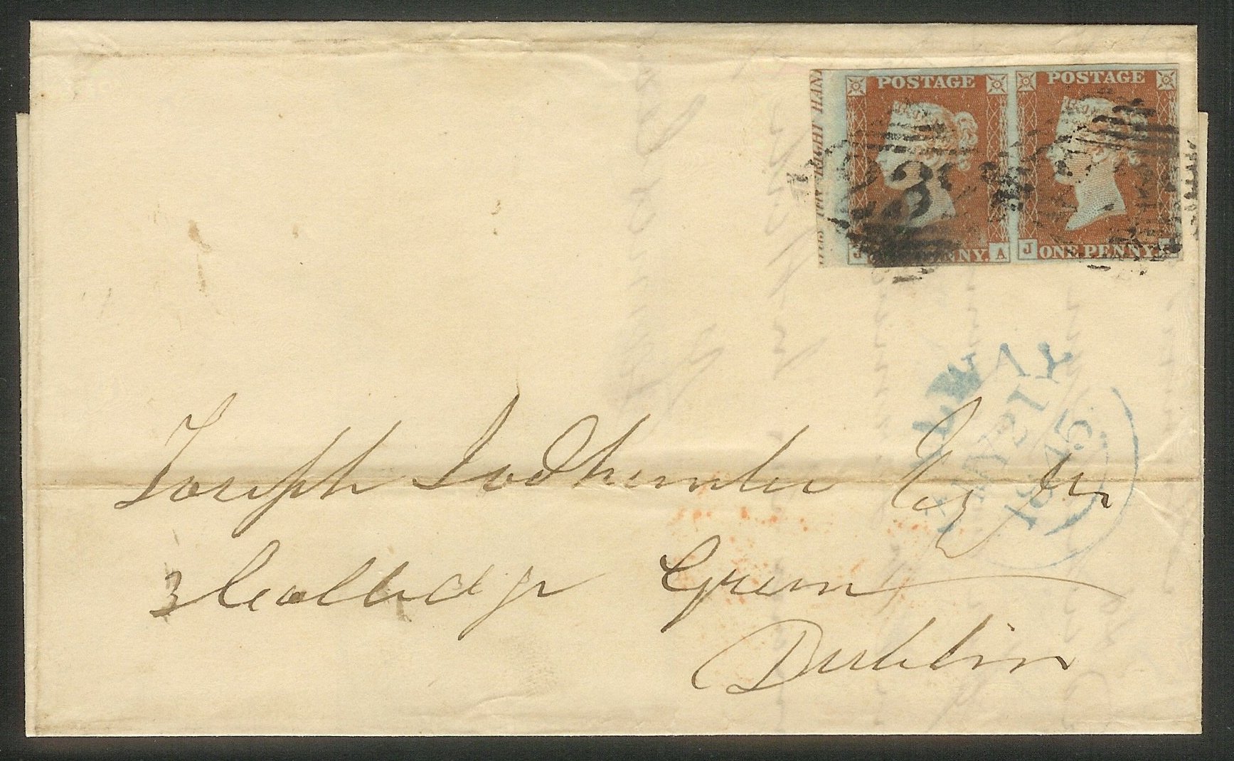 [JA-JB] pair, from Galway to Dublin, dated 21 May 1845, cancelled with black Irish numerals (232 Galway)