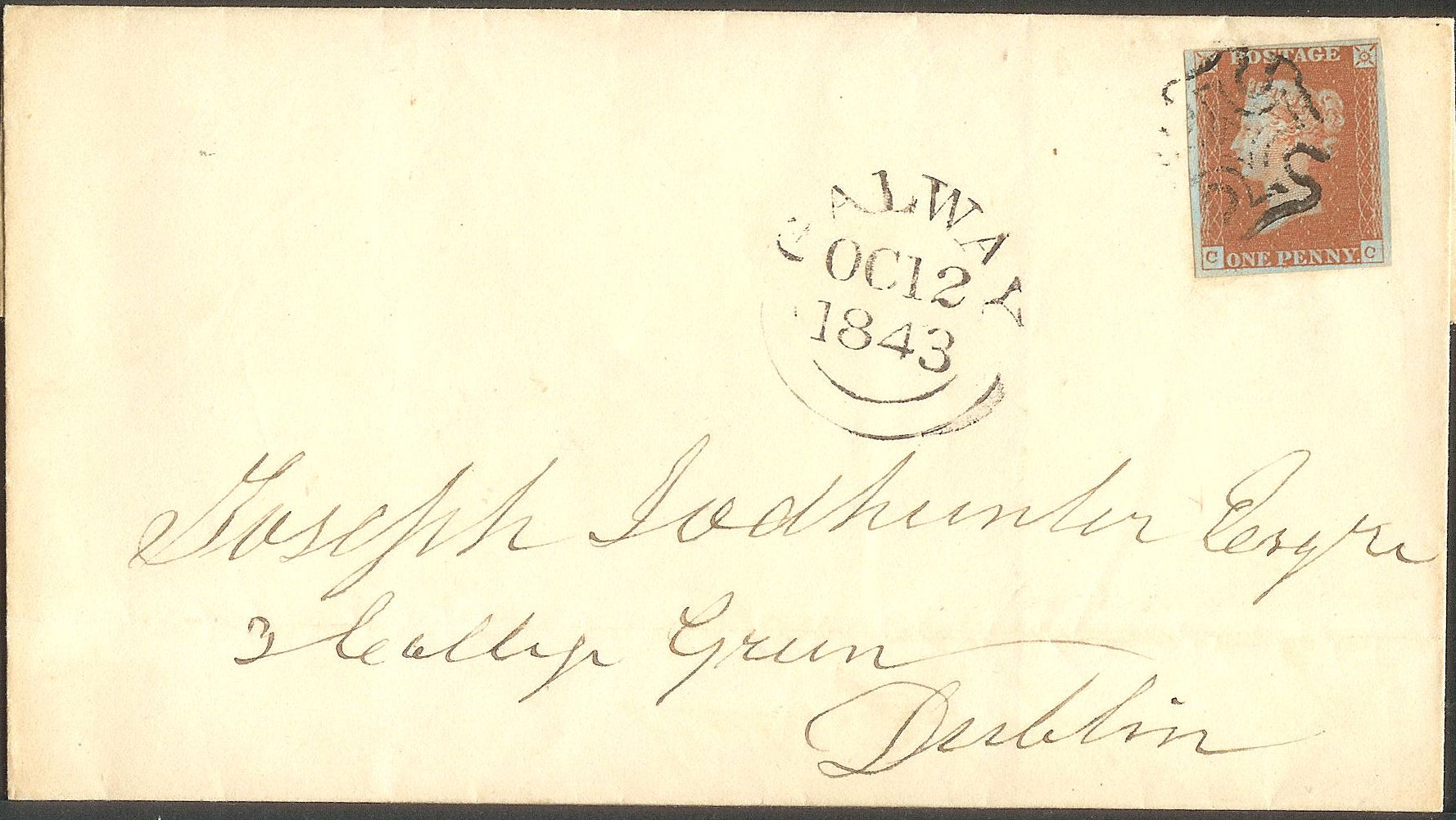 [CC] plate 34, from Galway to Dublin, dated 12 October 1843, cancelled with a black Maltese cross