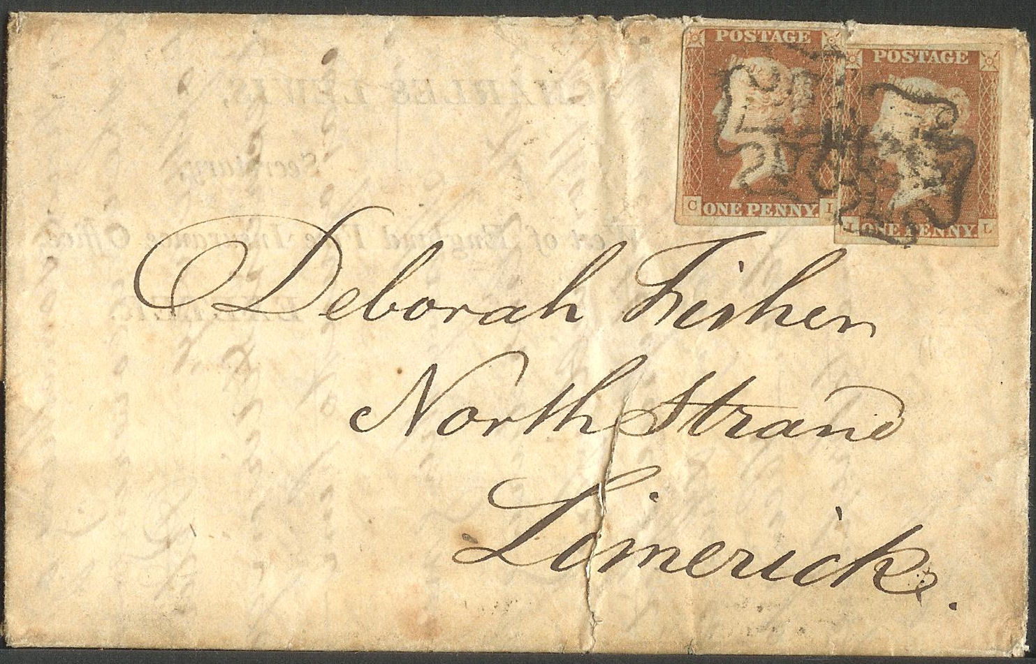 [DJ-DK] pair on entire from Ballina to Dublin dated 3 December 1848, cancelled with a single black Irish numeral (29 Ballina)Contrary to Regulations