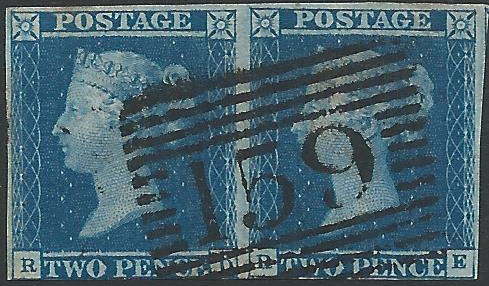 [RD-RE] pair, cancelled with a single black Scottish numeral (159 Glasgow) Contrary to Regulations