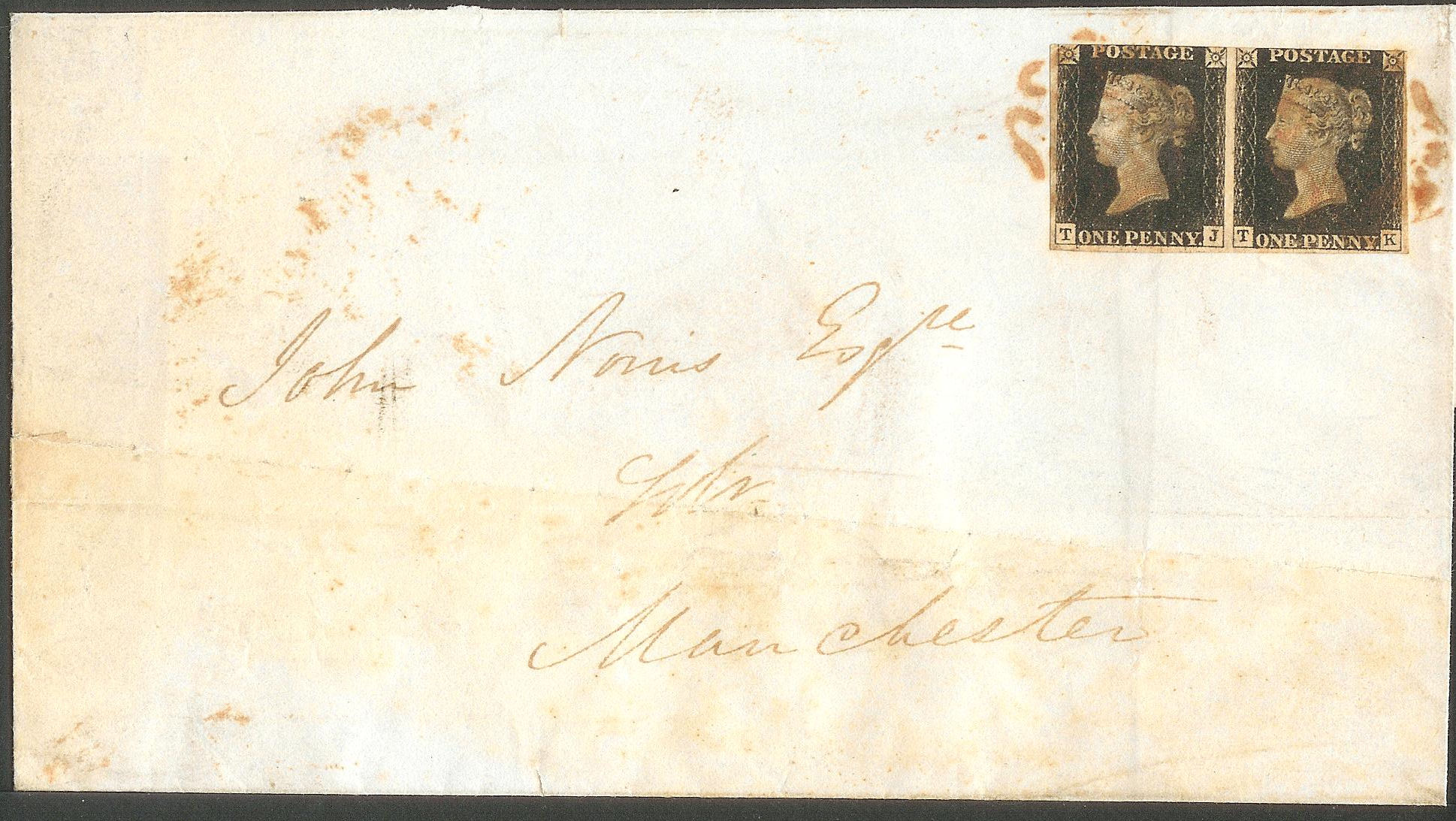 [TJ-TK] pair, from Liverpool to Manchester, dated 6 January 1841, cancelled with dark orange Maltese crosses